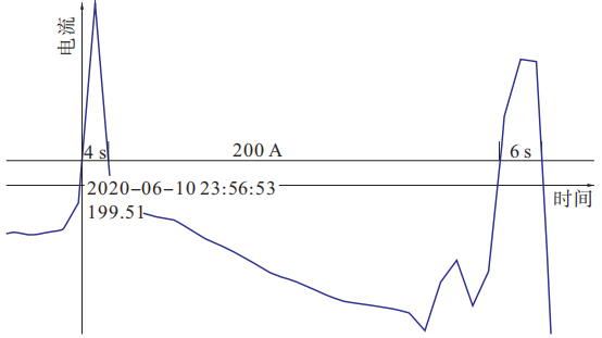 堵轉(zhuǎn)保護(hù)功能的主要特點(diǎn)是可以在電動機(jī)啟動完成后再投入,因此,可以不用考慮啟動的影響。如果將4#入窯提升機(jī)堵轉(zhuǎn)保護(hù)電流定值改為200A,時間定值改為2s,那么此次故障有兩個電流波峰均可以啟動保護(hù)動作。一次超過200A電流持續(xù)時間為4s,二次超過200A電流持續(xù)時間為6s,見圖5。