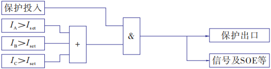 短路保護(hù)主要針對電動機(jī)電纜或繞組出現(xiàn)的短路故障,短路保護(hù)動作邏輯見圖1。任意一相電流超過設(shè)定值就應(yīng)立即保護(hù)動作,所以電流定值一般為額定電流的5~7倍,動作延時0s。提升機(jī)在運(yùn)行時幾乎不可能達(dá)到相應(yīng)整定電流,因此該保護(hù)僅對電動機(jī)具有保護(hù)作用,對提升機(jī)其他部件沒有保護(hù)作用。